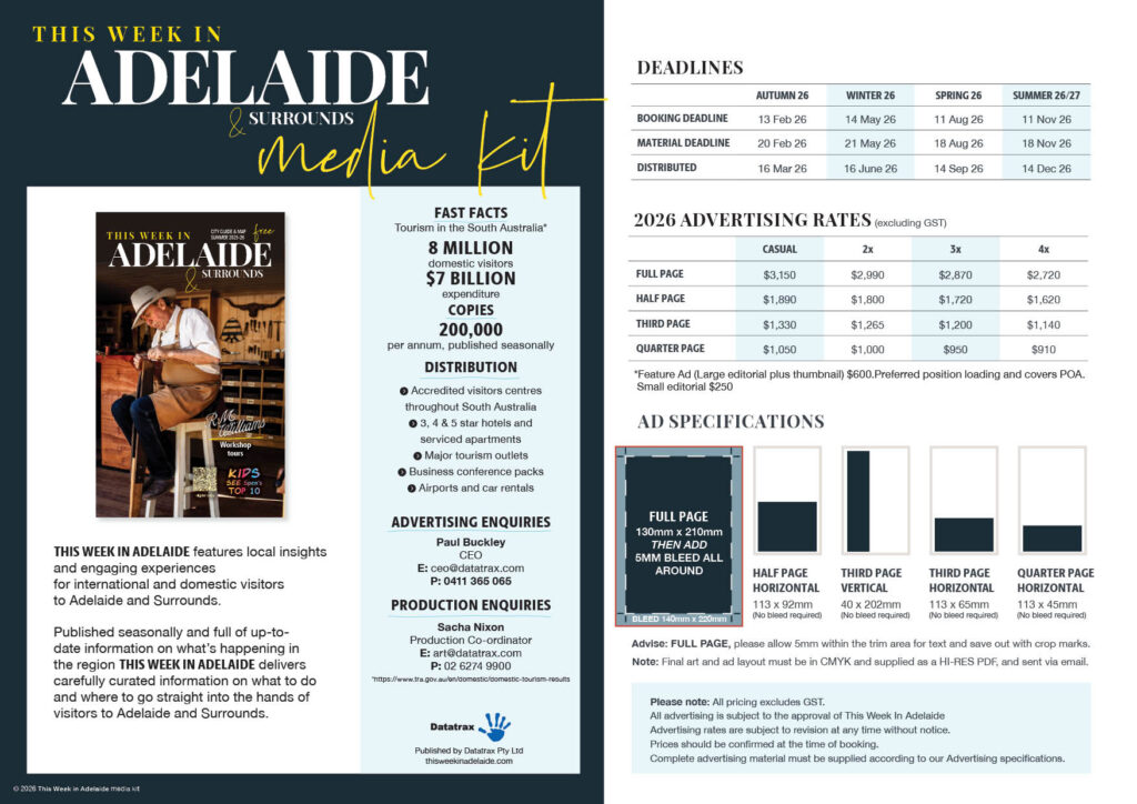 This Week in Adelaide is a must-have for international and domestic visitors seeking expert advice and guidance to travelling within South Australias capital.